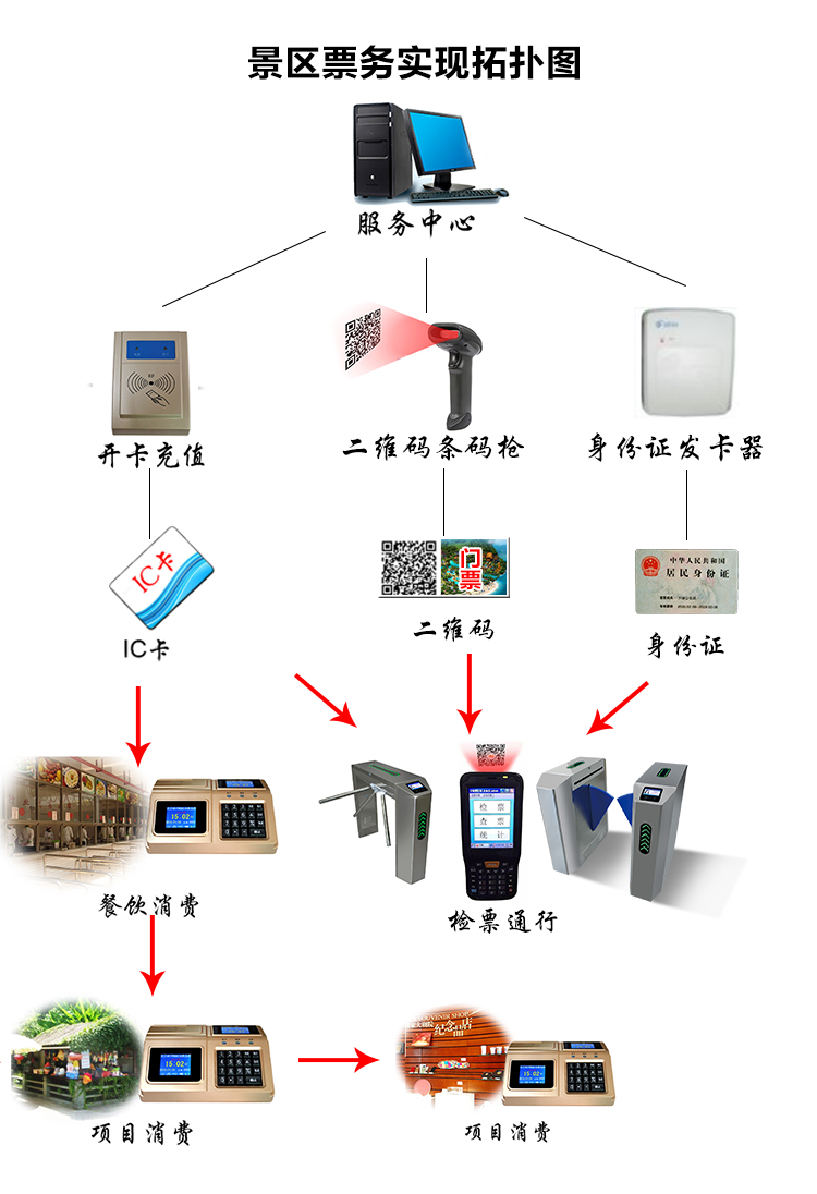 景區(qū)票務系統(tǒng)運用于旅游景區(qū)、主題公園、博覽會、展覽館等應用領域。游客到達景區(qū)售票點購買門票,在售票過程中同時售票數(shù)據(jù)被寫入服務器數(shù)據(jù)庫中。游客持ID/IC卡、一維碼、二維碼,或者二代身份證,這些類型的門票介質到景區(qū)入口,經(jīng)過通道閘驗票通行,門票僅有一次驗票機會,游客安全進入景區(qū)。售票數(shù)據(jù)和驗票進門數(shù)據(jù)在授權的情況下可實時查詢,各種財務報表可實時查詢、打印。